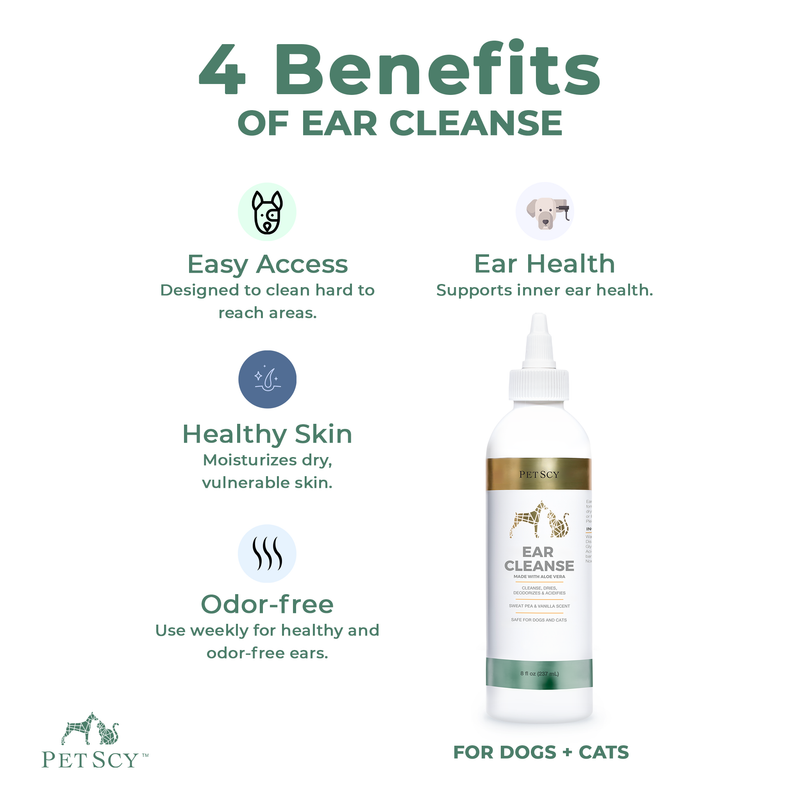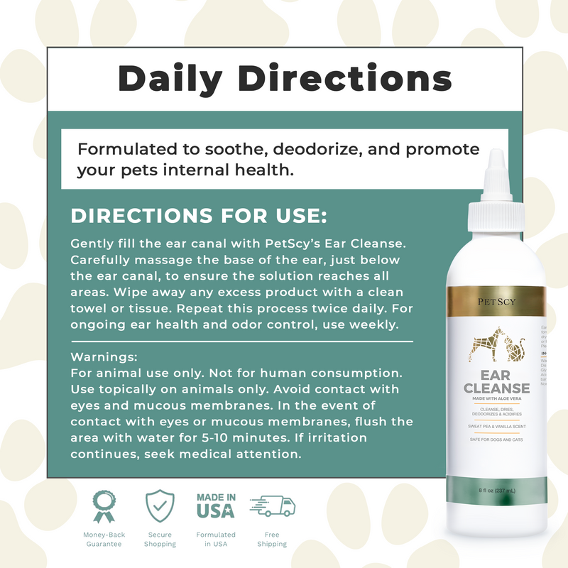 Gently fill the ear canal with PetScy’s Ear Cleanse. Carefully massage the base of the ear, just below the ear canal, to ensure the solution reaches all areas. Wipe away any excess product with a clean towel or tissue. Repeat this process twice daily. For ongoing ear health and odor control, use weekly.