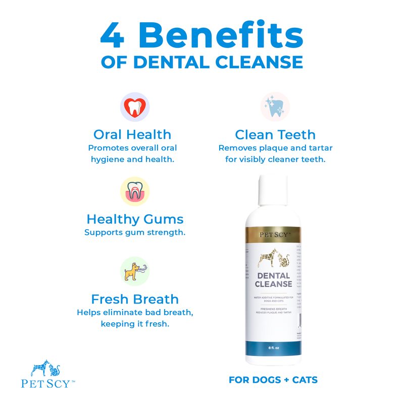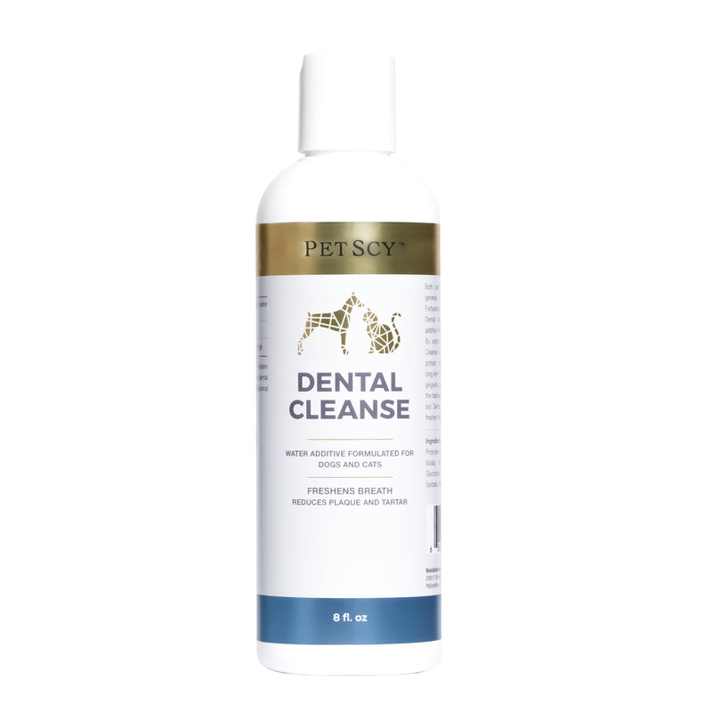 Struggling with the hassle of brushing your pet’s teeth at home? PetScy’s Dental Cleanse offers a hassle-free solution for healthier, whiter teeth and fresher breath. This daily water additive effectively targets yellow tartar and the compounds responsible for bad dog breath without the need for difficult tooth brushing.