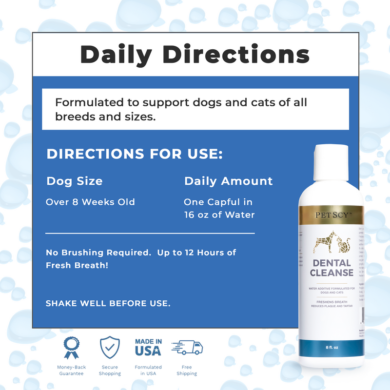 PetScy’s Dental Cleanse is formulated to support dog and cat of all breeds and sizes, including pets over 12 weeks old.