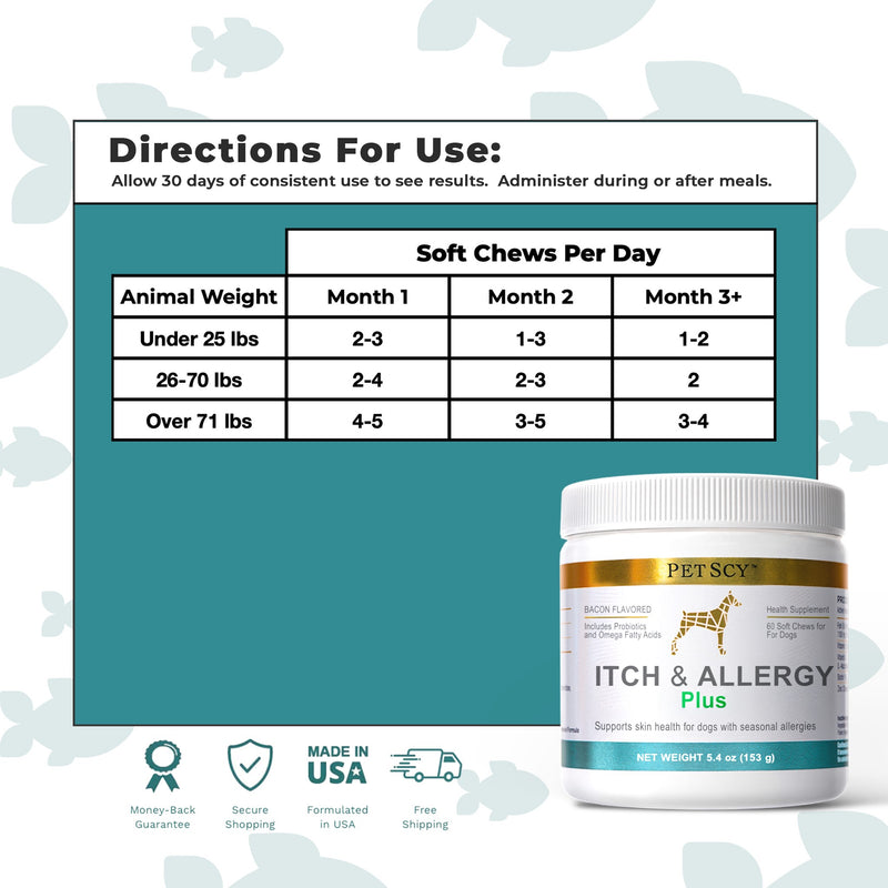 - SSSusan S.Verified BuyerReviewingItch & Allergy Plus ChewsI recommend this productPet's weight 40 - 60 lbsPet's age? 4-6 years oldRated 5 out of 5 stars5 days agoAmazing Results