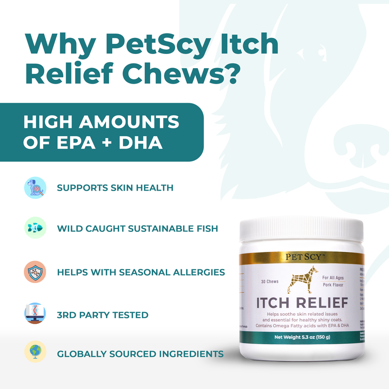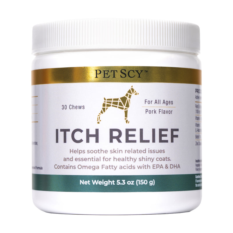 PetScy’s Itch Relief Chews are made with essential fatty acids and delicious ingredients to help soothe your dog's skin and maintain a thick, glossy coat. Our unique blend of ingredients help address itching, dry skin, paw licking, head shaking, and other common signs of seasonal allergy discomfort.