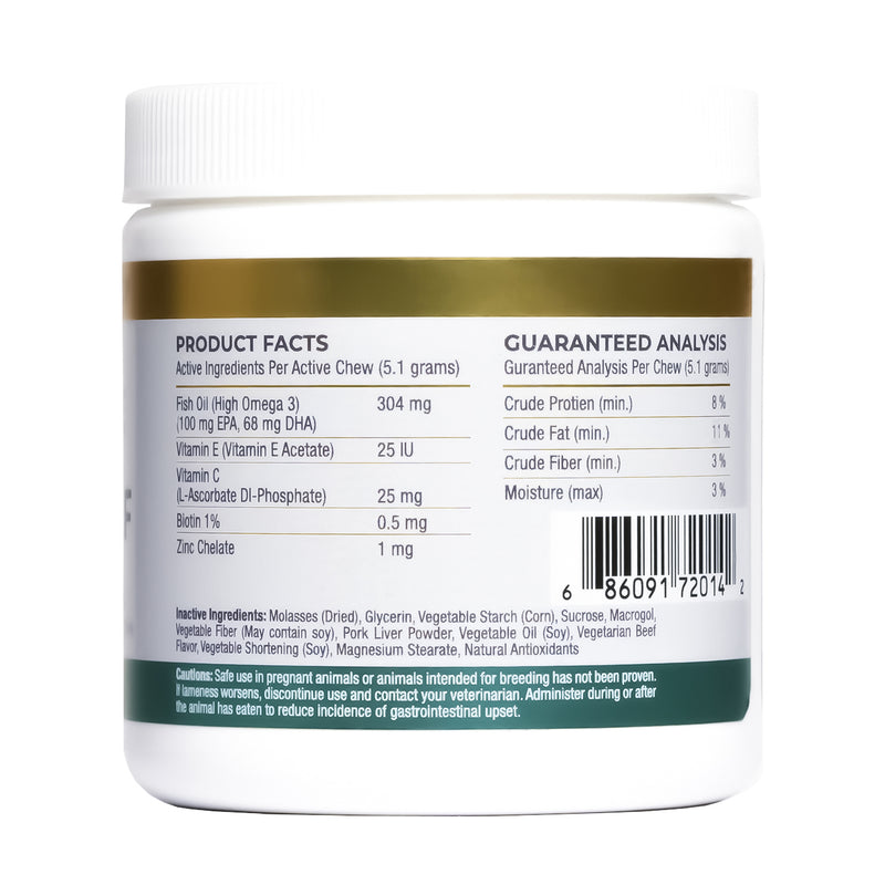 (100mg EPA, 68 mg DHA)304mg Vitamin E (Vitamin E Acetate) 25IU Vitamin C (L-Ascorbate DI- Phosphate) 25mg Biotin 1% 0.5mg Zinc Chelate 1mg Inactive Ingredients: Fish Oil, Glycerin, Macrogol, Magnesium Stearate, Molasses (dried), Natural Antioxidants, Pork Liver Powder, Sucrose, Vegetable Fiber (may contain soy), Vegetable Oil (soy), Vegetable Shortening (soy), Vegetable Starch (corn)
