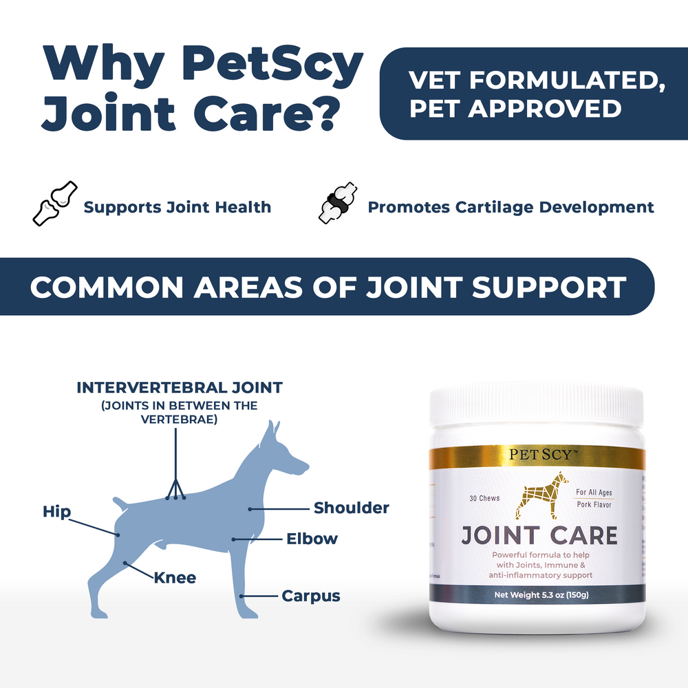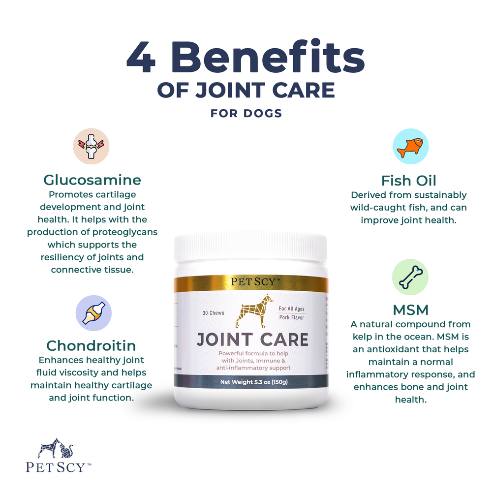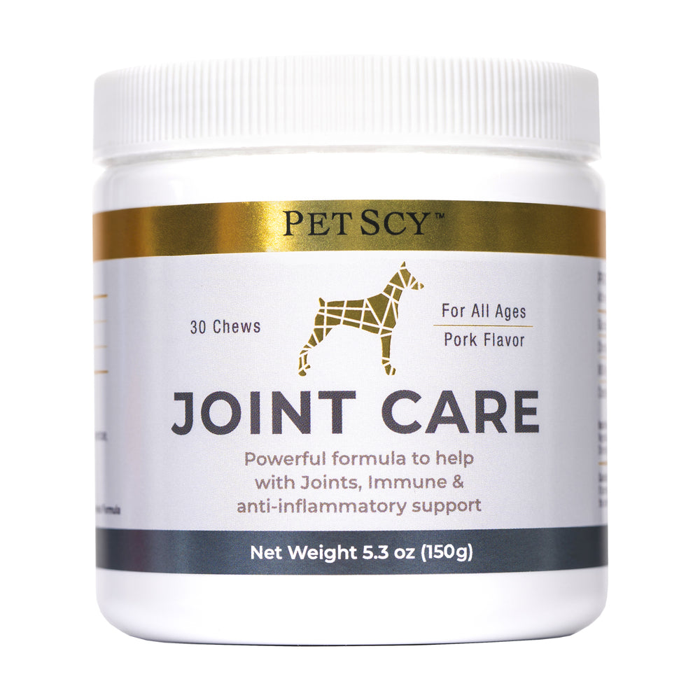 Ensuring our dogs stay happy and active—whether running, jumping, walking, or playing—is our top priority. PetScy's Joint Care chews embodies this commitment with a unique blend of proven Eastern and Western ingredients designed to support bone health and joint function in dogs of all sizes.