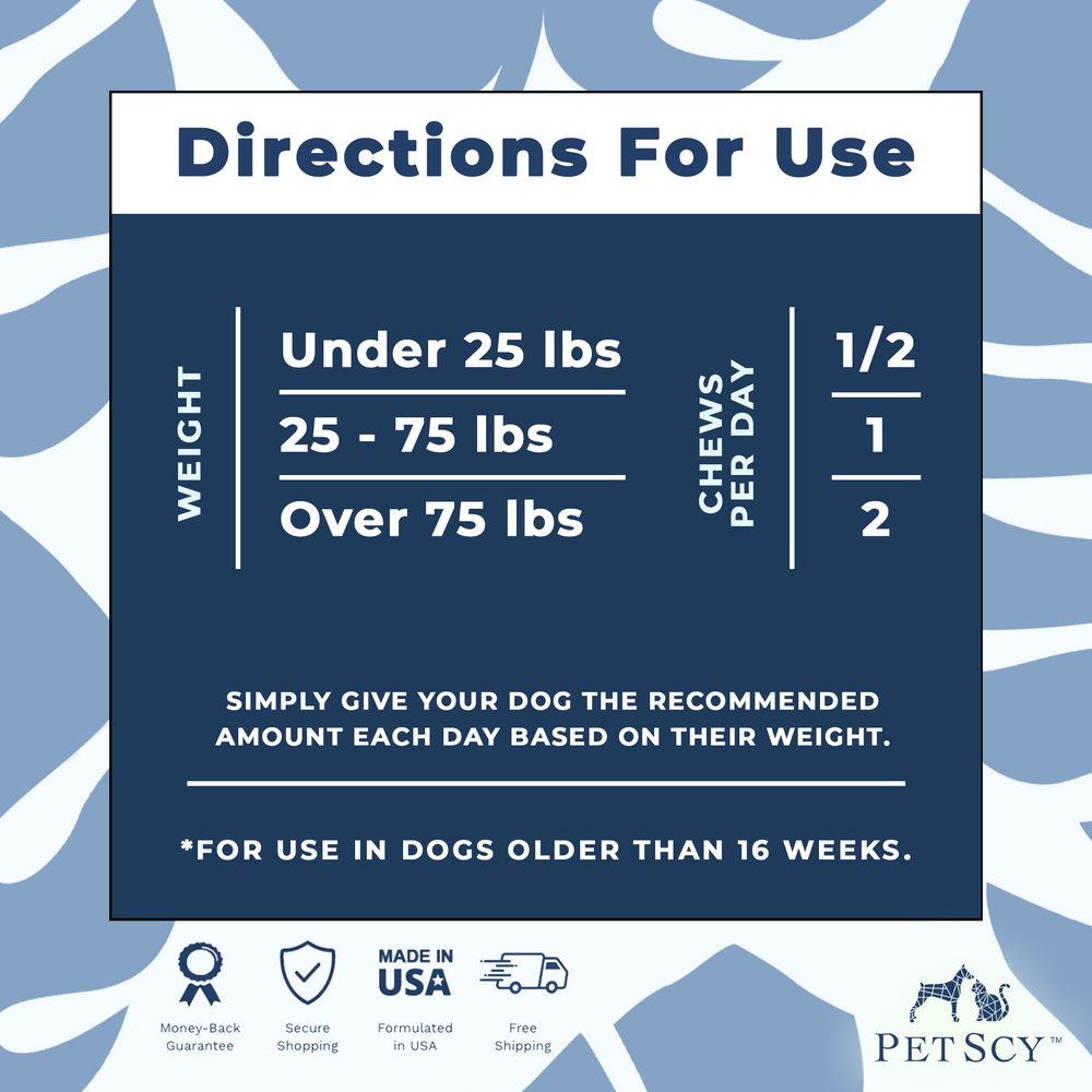 Directions For UseDog SizeDaily ChewsSmall DogsUnder 25 lbs1/2 soft chew dailyMedium Dogs25–75 lbs1 soft chew dailyLarge DogsOver 75 lbs2 soft chews daily