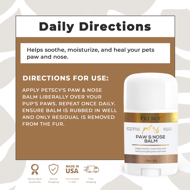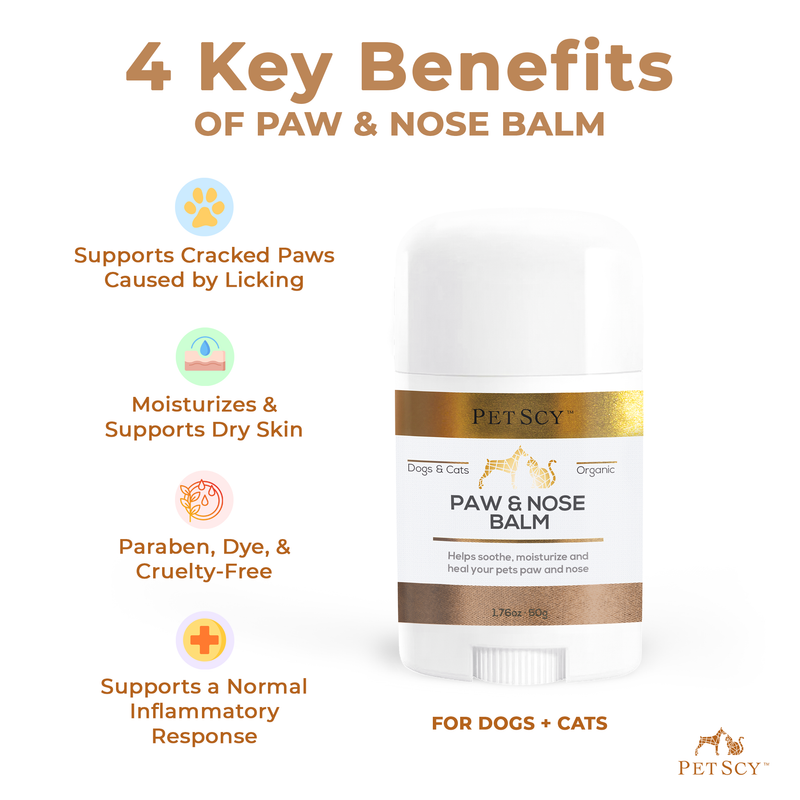 Our carefully selected ingredients are renowned for their hydrating and restorative properties, ensuring that your pet's skin remains supple, moisturized, and protected against the elements. Whether dealing with dryness, irritation, or simply aiming for optimal skin health, PetScy’s Paw & Nose Balm is the ideal choice for comprehensive skin care.