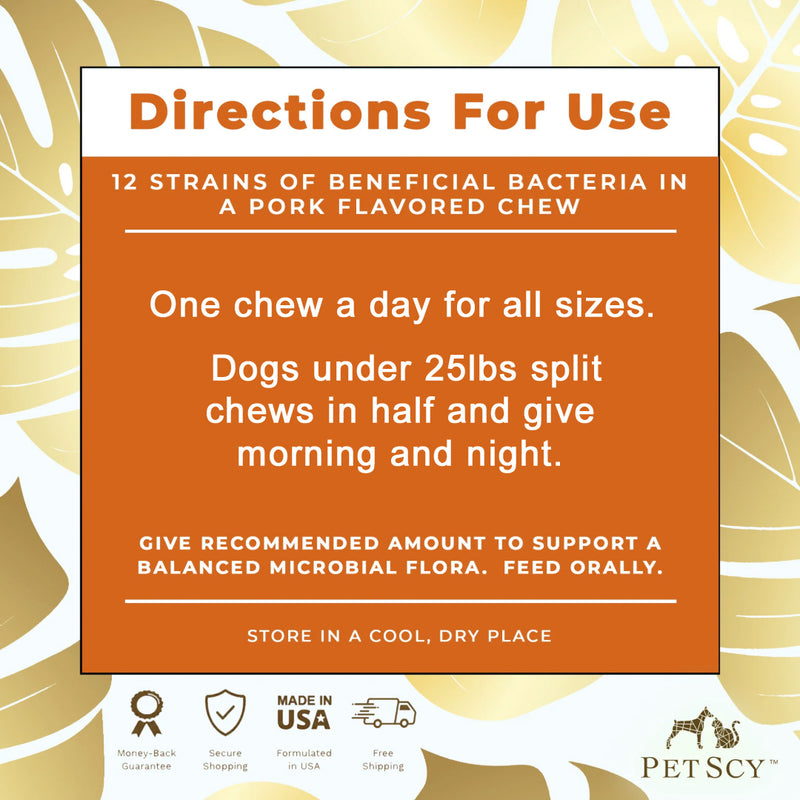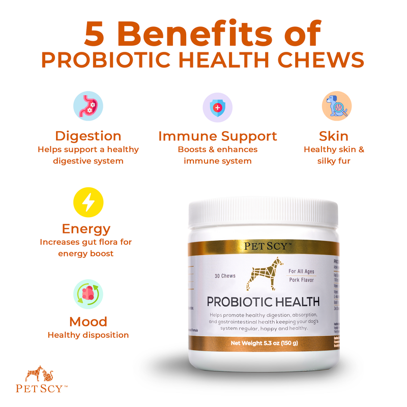 PetScy’s Probiotic Health Chews contain a potent blend of beneficial microorganisms that work to maintain the delicate balance of your dog's digestive system. These probiotics are designed to reduce loose stools often triggered by environmental or dietary changes, while also bolstering the immune system and promoting healthy skin.